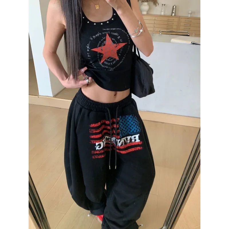 Das Design wird durch den Vintage-Print mit USA-Flagge abgerundet, der dem Look einen coolen, urbanen Touch verleiht. Der elastische Bund mit Kordelzug sorgt dafür, dass du die Hose ganz nach deinen Bedürfnissen anpassen kannst – ohne einzuengen.